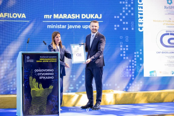 Kako dodaju, na svečanosti povodom Međunarodnog dana javne uprave direktorica Regionalne škole javne uprave (ReSPA), Maja Handjiska-Trendafilova, ministru javne uprave Marašu Dukaju, uručila je ovo prestižno zvanje, kao potvrdu da Ministarstvo primjenjuje najviše standarde upravljanja kvalitetom u skladu sa Zajedničkim okvirom za procjenu kvaliteta (CAF – Common Assessment Framework), koji koriste javne uprave širom Evrope.