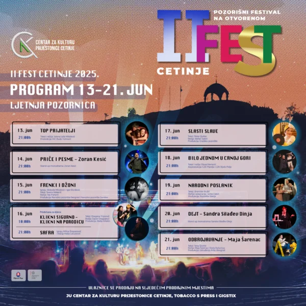Drugo izdanje pozorišnog festivala na otvorenom – II FEST CETINJE – održaće se od 13. do 21. juna 2025. godine na Ljetnjoj pozornici, u organizaciji Centra za kulturu Prijestonice Cetinje, uz podršku Prijestonice Cetinje i Ministarstva kulture i medija Crne Gore.