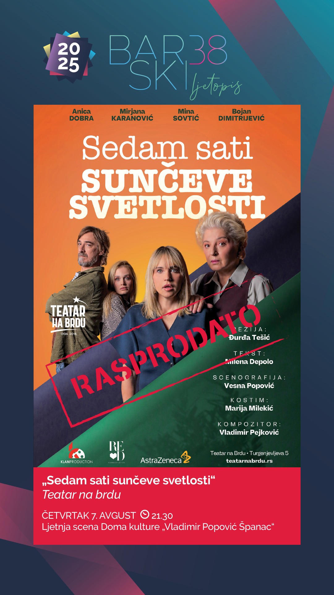 U okviru pozorišne selekcije 38. „Barskog ljetopisa“ večeras u 21.30 na Ljetnjoj sceni Doma kulture „Vladimir Popović Španac“ gostuje Teatar na brdu sa izuzetnom savremenom dramom „Sedam sati sunčeve svetlosti“, autorke Milene Depolo, u režiji Đurđe Tešić.