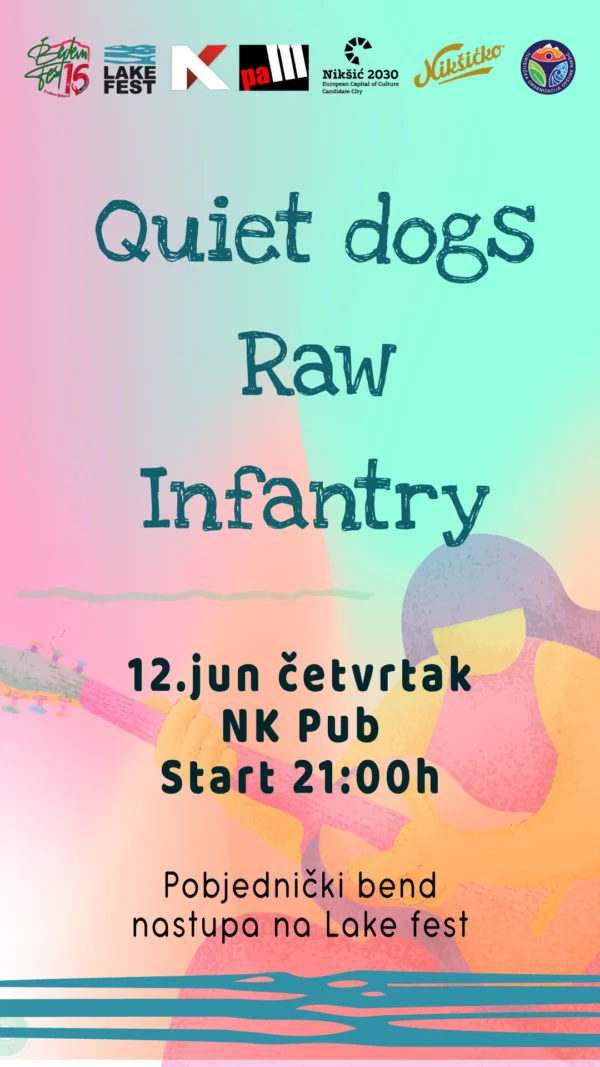 U U prvoj grupi nalaze se bendovi Petrikor 1858, Kolektiv 0 i bend Paradigma i oni će nastupati u srijedu 11.juna dok će druga grupa u kojoj se nalaze bendovi Quiet dogs, Raw i Infantry takmučiti u četvrtak 12.juna. Glasovima tročlanog žirija pobjednici prve večeri nastupiće na Bedem festu dok će po istim principu pobjednici druge večeri nastupiti na Lake festu. Kao specijalni gosti druge superfinalne večeri u NK Pubu publici će se predstaviti bend KUD Kuvajt iz Mostara. Iz organizacije pozivaju ljude da dođu na uživo svirke u NK Pubu u Nikšiću kako bi čuli aktuelnu mladu muzičku rok scenu a fanovi podržali svoje bendove favorite.